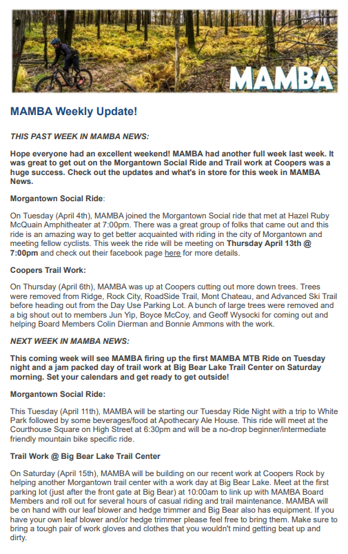Vice President, Morgantown Area Mountain Bike Alliance (MAMBA)